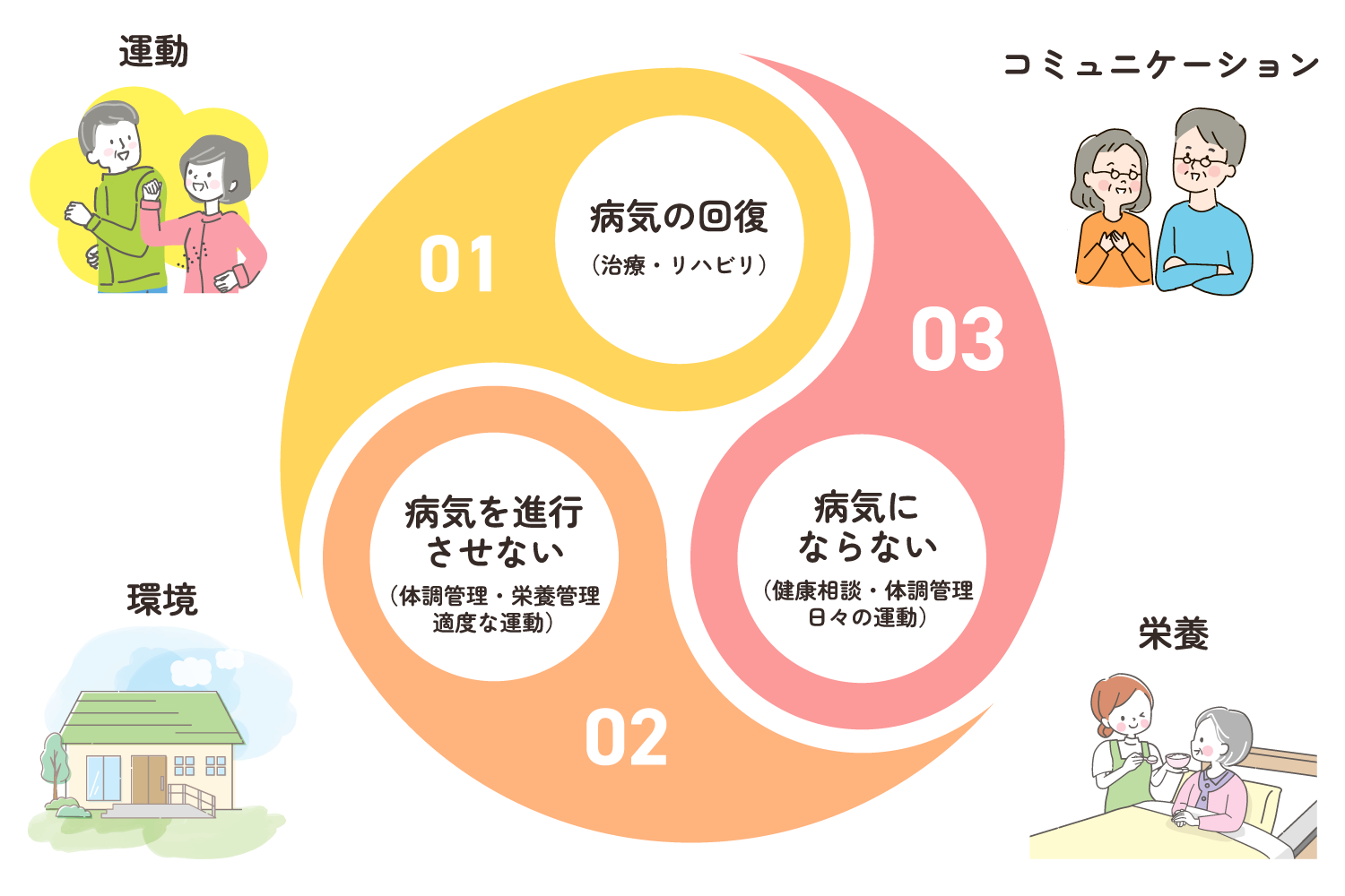 健康な在宅生活を送るため、病気に対する看護技術だけでなく「病気の回復」「進行させない」「病気にならない」を行うため、多方面からのアプローチを行いサービスを提供します。